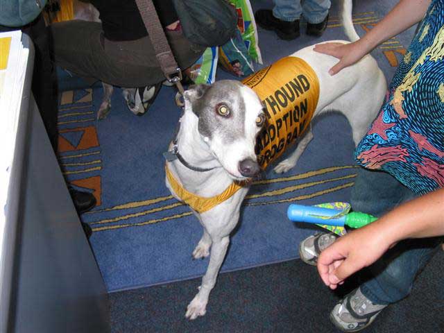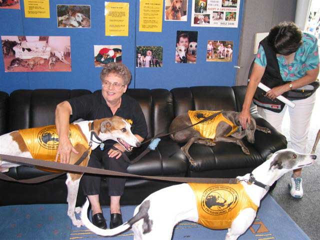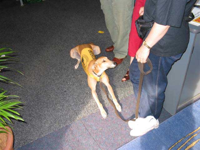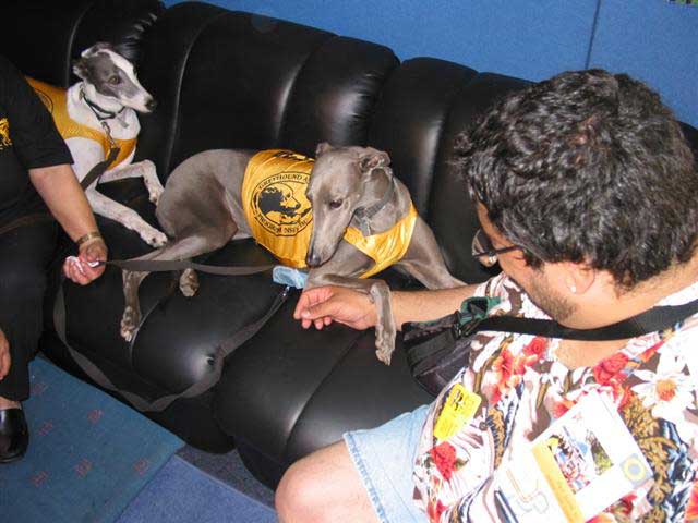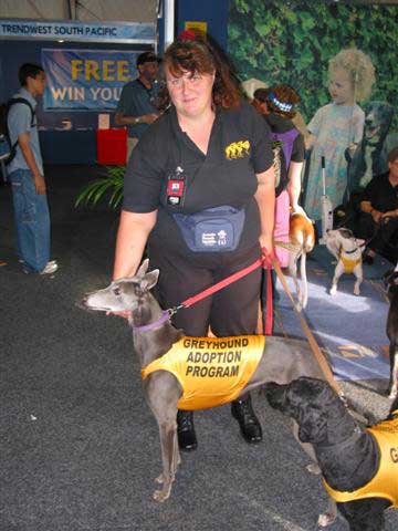 The Greyhound Adoption Programme of New South Wales (GAP for short) has a booth here for the duration of the show. We dedicate this page to the dogs whose ears we scritched today: to Josh, to Lilly, to Amber, to Nikki, to Katie, to Pipi, and to Sam the poodle. We also dedicate this to the wonderful volunteers of GAP of NSW who allowed us to get to meet their dogs. |