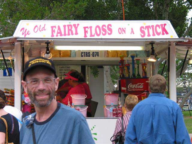 Friday, 11 April 2003 - (22 KB) Tom and a pig on a pole outside the show's entryway |