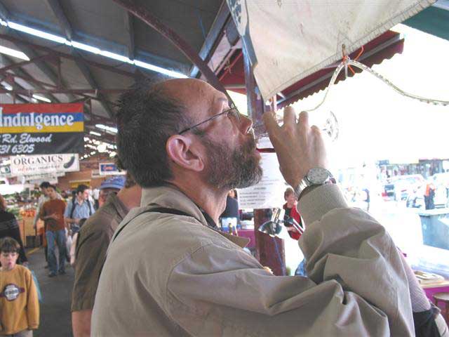 Saturday, 19 April 2003 - (37 KB) Tom samples some wines at the Queen Victoria Market to bring to dinner at cousins house tonight |